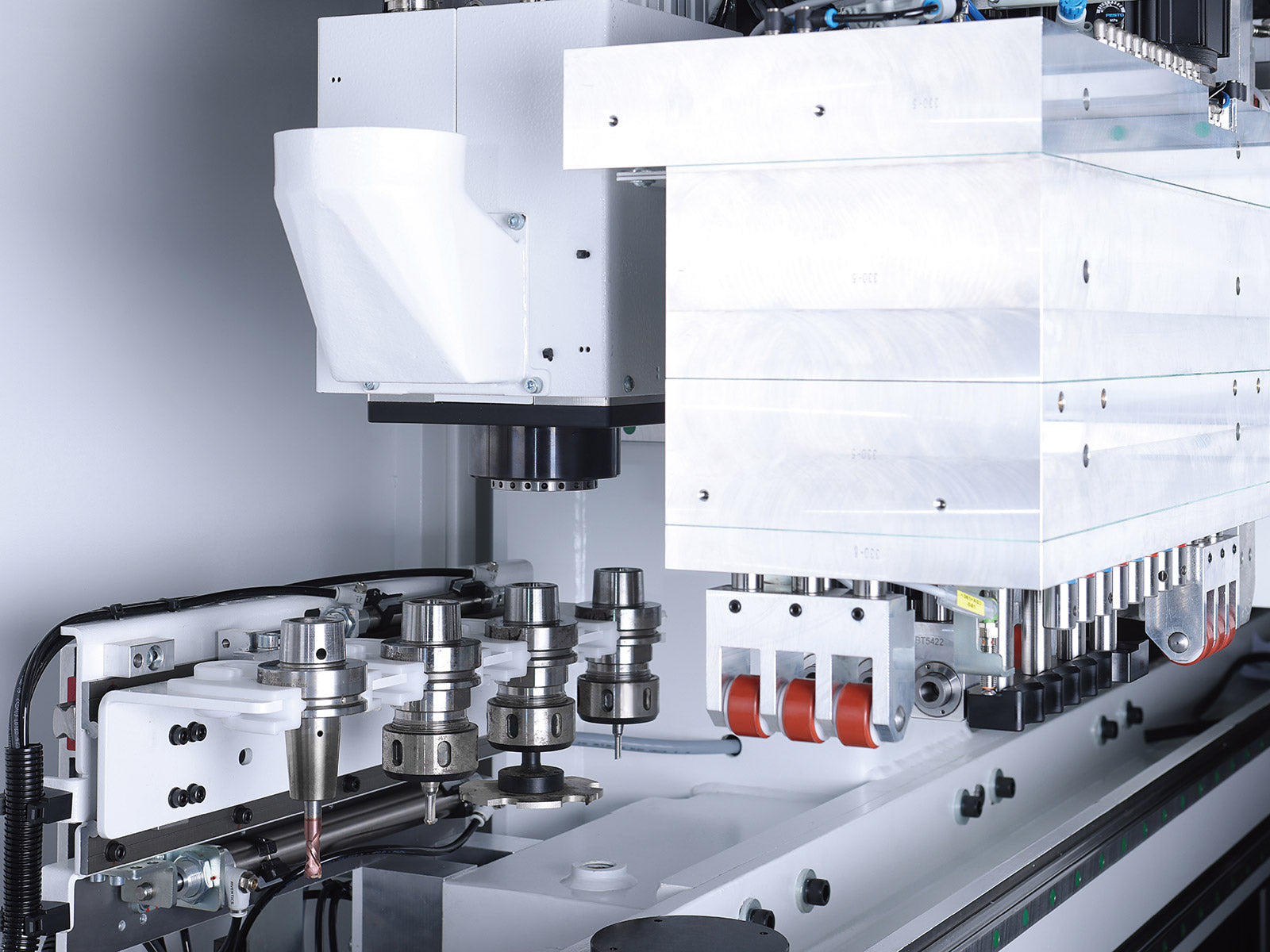 Operation with one working field for precise drilling process at panels in all 6 sides. The workpieces are optimally positioned by CNC-controlled clamps. High-speed drilling spindles and routers are available. With optional tool change spindle, more application can be realized on this machine in order for high-level flexibility.